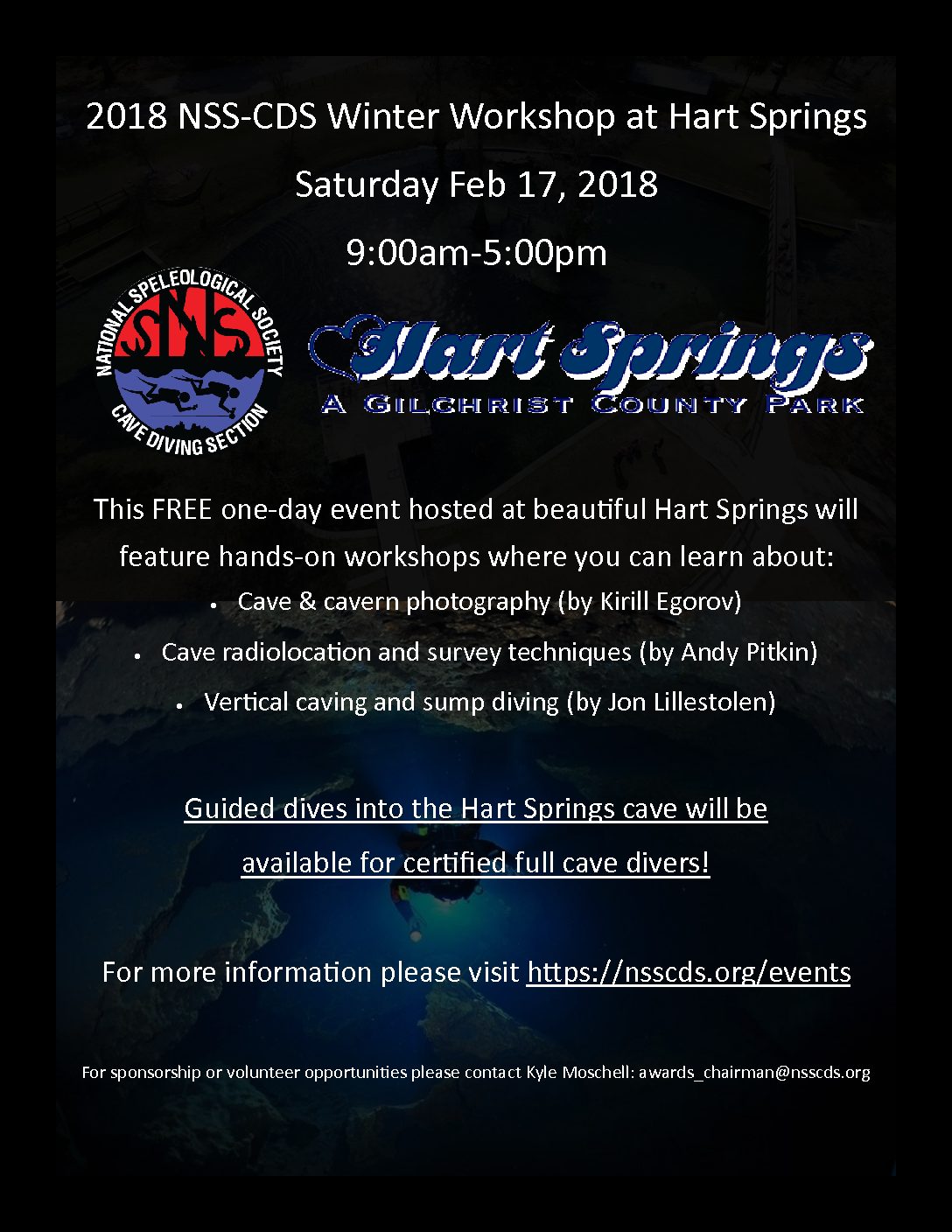 The NSS-CDS will be conducting an Overhead Nitrox Diver certification course, free of charge, for any divers certified Cavern or above who have not yet taken a Nitrox course. This will take place during the workshop and will take about 1.5-2 hours. No in-water activities are required for the course, the only thing you need to bring is your Cavern or Cave certification card.